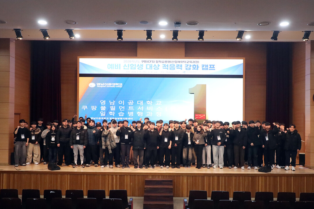 [대학저널 이선용 기자] 영남이공대학교는 2026학년도 쿠팡풀필먼트서비스(CFS) 일학습병행(산업체위탁교육과정) 예비 신입생을 대상으로 한 ‘적응력 강화 캠프’를 1월 15~16일 1박 2일간 천마스퀘어 시청각실에서 진행했다.