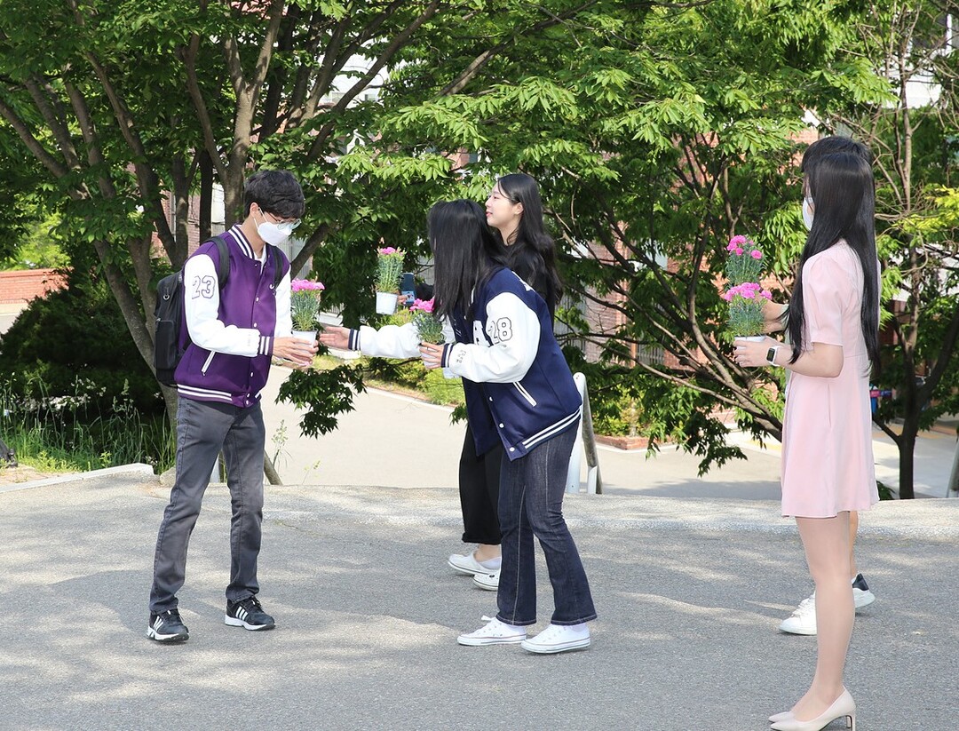 한서대 학생운영위원회는 학생들이 스승의 날이자 성년의 날을 맞아 카네이션꽃 화분을 무료로 나눠주는 행사를 히고있다. 사진=한서대 제공 |