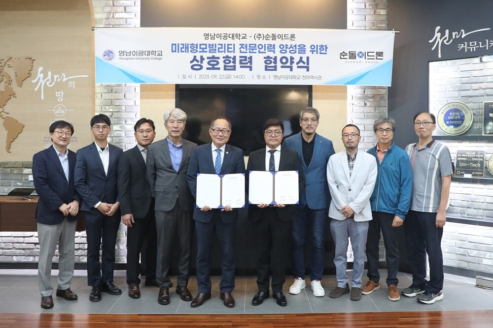 영남이공대가 22일 ㈜순돌이드론과 미래형모빌리티 전문인력 양성을 위한 상호협력 협약을 체결했다. 사진=영남이공대 제공 |