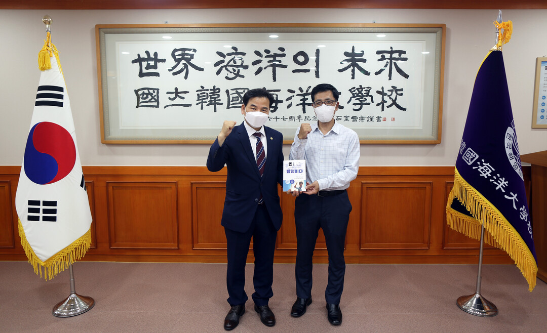 | 도덕희(왼쪽) 한국해양대 총장과 강동석 탐험가가 지난해 7월 환담회에서 강 탐험가가 쓴 '인생은 탐험이다'를 들고 파이팅을 외치고 있다. 사진=한국해양대 제공 |