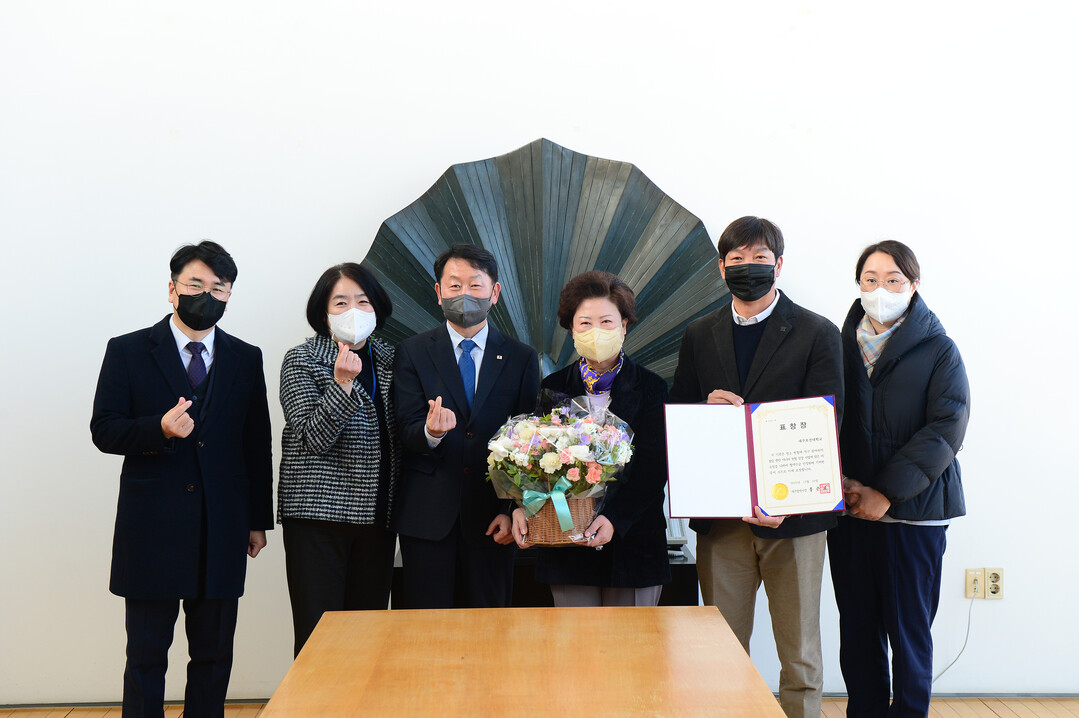 남성희(왼쪽에서 네번 째) 총장 등 대구보건대 관계자들이 혈액수급 안정화에 기여한 공로로 대구시장 표창을 수상한 뒤 기념촬영하고 있다. 사진 = 대구보건대 제공 |