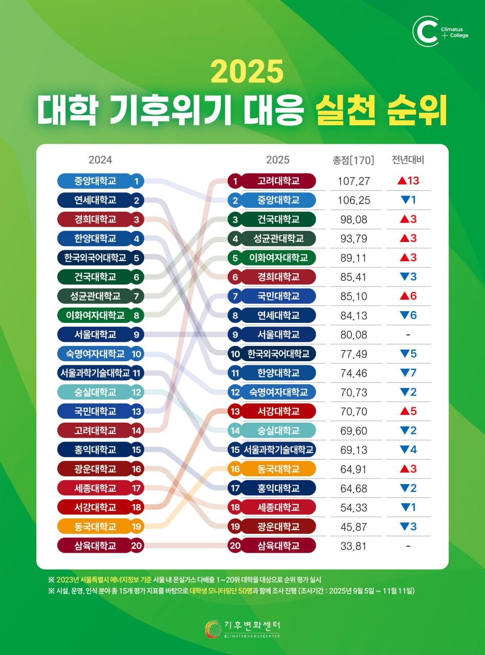 [대학저널 이선용 기자] 고려대학교가 기후위기 대응 실천 평가에서 전국 1위를 차지했다.