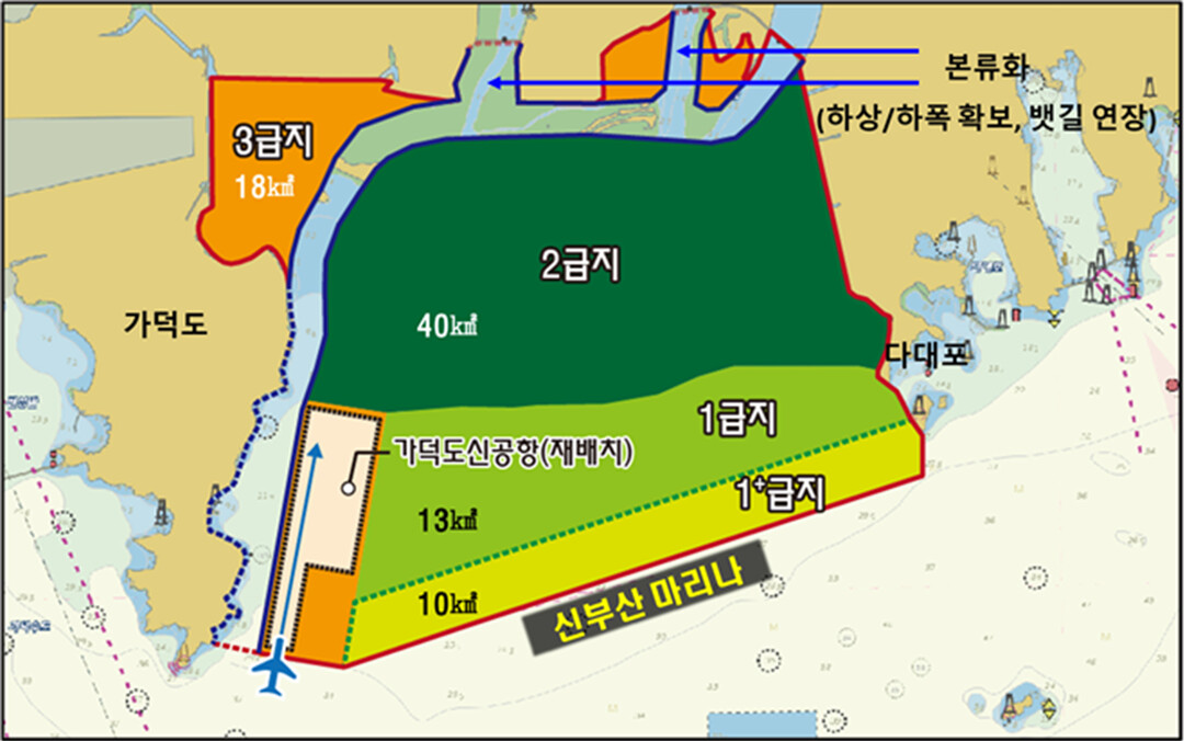 세종대 환경에너지융합학과 노준성 교수는 “가덕도와 다대포를 연결하는 연안은 수심이 20미터 이내로 얕아 총길이 12㎞의 방조제를 건설하고 내륙 부분을 매립하면 광활한 면적을 확보할 수 있다”고 설명했다. 이어 “현재 정부에서 계획하고 있는 가덕도 신공항의 활주로 방향을 변경하고, 낙동강 하구의 수로를 가덕도 방향으로 이동해 방조제 주변을 ‘신부산 마리나’ 지역으로 개발해야 한다”는 계획을 제시했다.