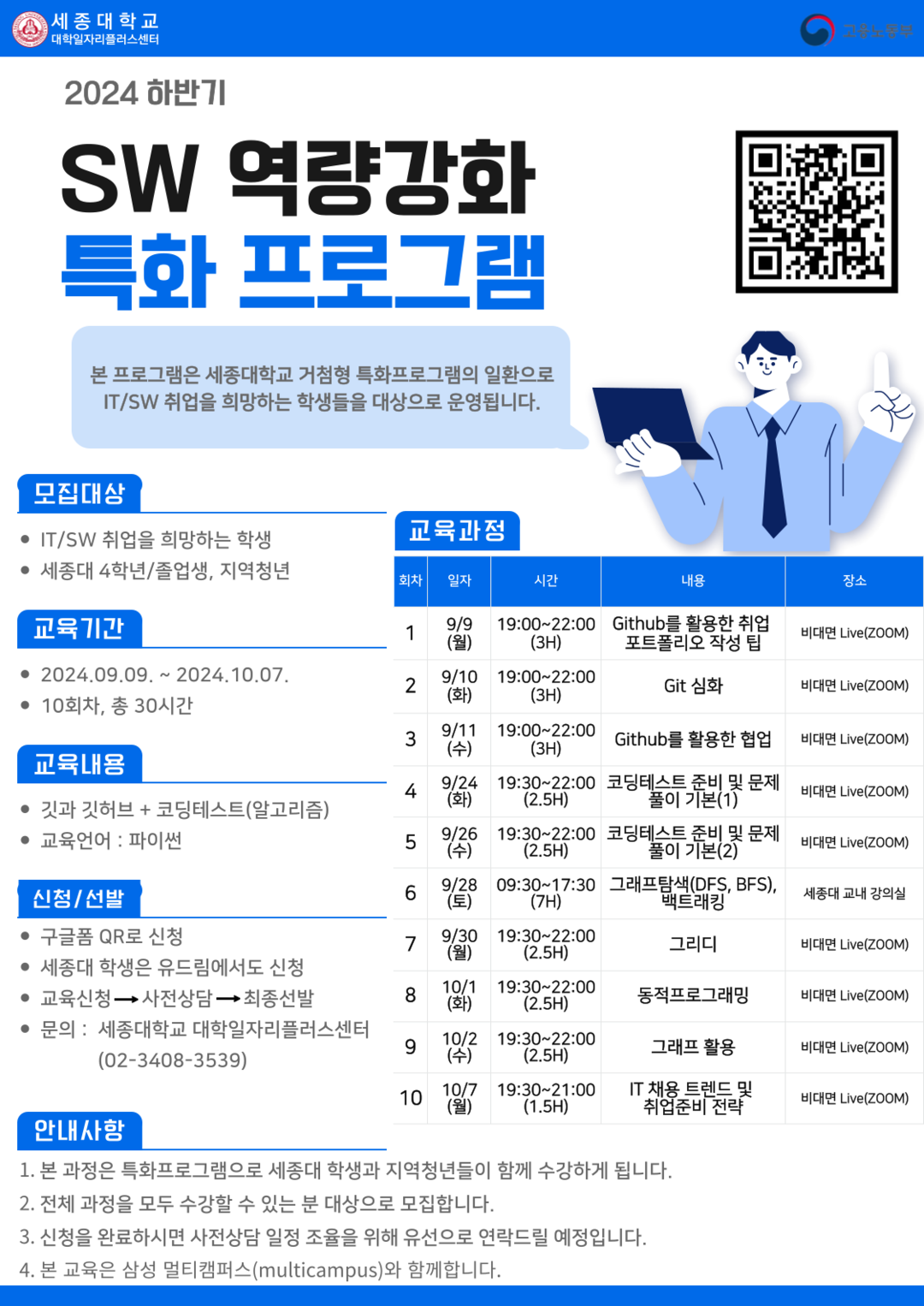 이번 프로그램은 오는 9월 9일부터 10월 7일까지 진행되며, 참여 대상은 세종대 재학생 및 졸업생뿐만 아니라, IT/SW 취업을 희망하는 지역청년이라면 누구나 참여 가능하다.