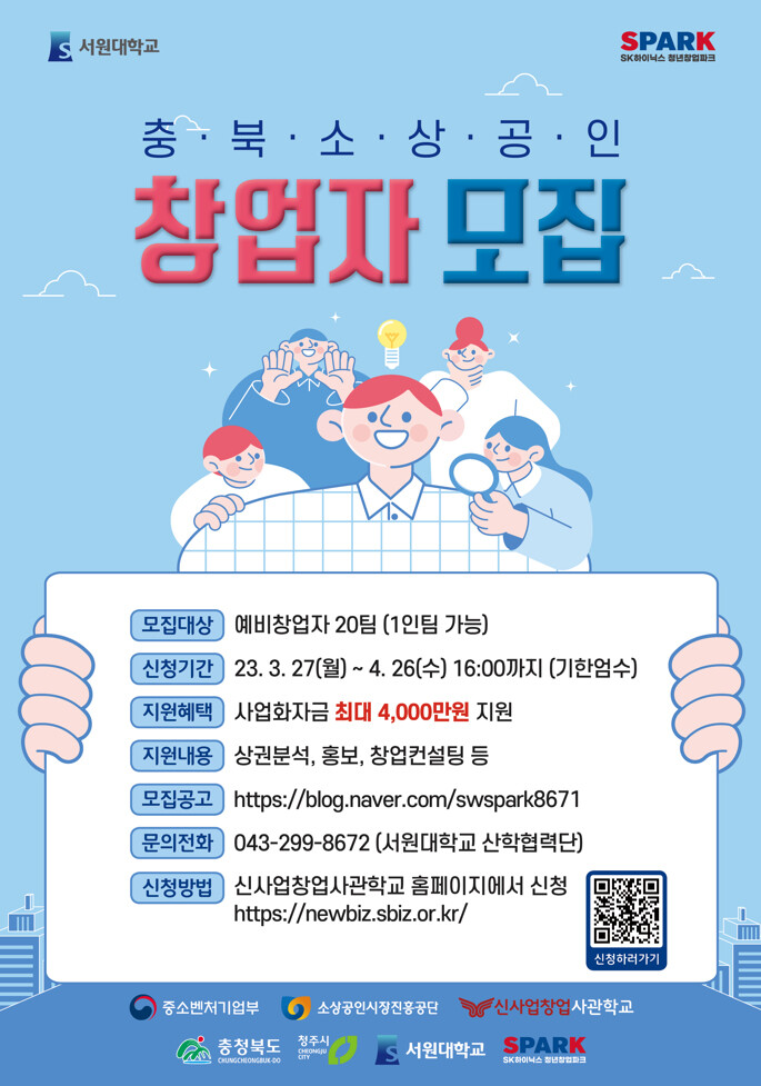 자세한 사항은 서원대학교 산학협력단 홈페이지 공지사항에서 확인할 수 있으며, 서원대 SK하이닉스청년창업파크사업단(043-299-8672)으로 전화 문의도 가능하다.