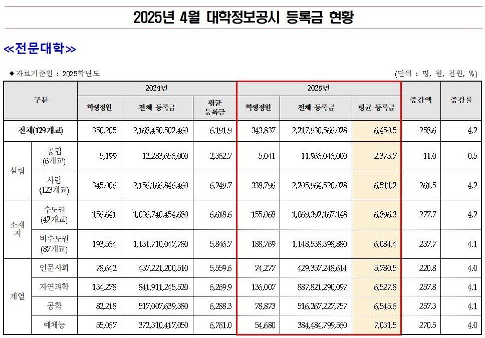 또 전문대학생 1명이 연간 부담하는 평균 등록금은 645만500원으로 전년(619만 1900원)보다 25만 8600원(4.2%) 상승했다. 설립 유형별로는 사립대 651만1200원, 공립대 237만3700원이다.