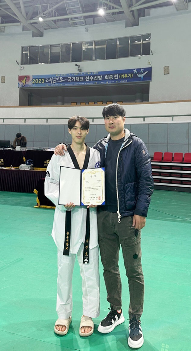 | 태권도 국가대표 선수로 선발된 김진호(왼쪽) 청주대 선수가 상장을 들고 김학환 감독과 포즈를 취하고 있다. 사진=청주대 제공 |