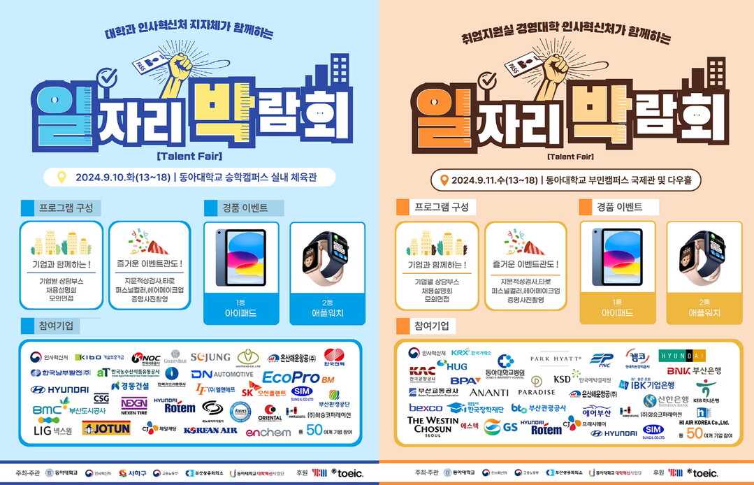 동아대와 인사혁신처, 고용노동부, 부산 사하구, 동아대 총동문회, 동아대 총학생회가 주관하고 한국토익위원회가 후원하는 이번 행사는 동아대 승학캠퍼스 실내체육관에서 오는 10일 오후 1시부터 6시까지, 부민캠퍼스 경영대학과 국제관 일대에서 11일 오후 1시부터 6시까지 각각 열린다.
