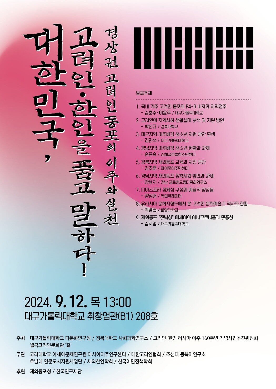 경북대 사회과학연구원, 월곡고려인문화관 결, 고려대 아세아문제연구원 아시아이주연구센터, 대한고려인협회 등 다수의 기관이 공동 주최 및 주관하며, 재외동포청과 한국연구재단이 후원한다.