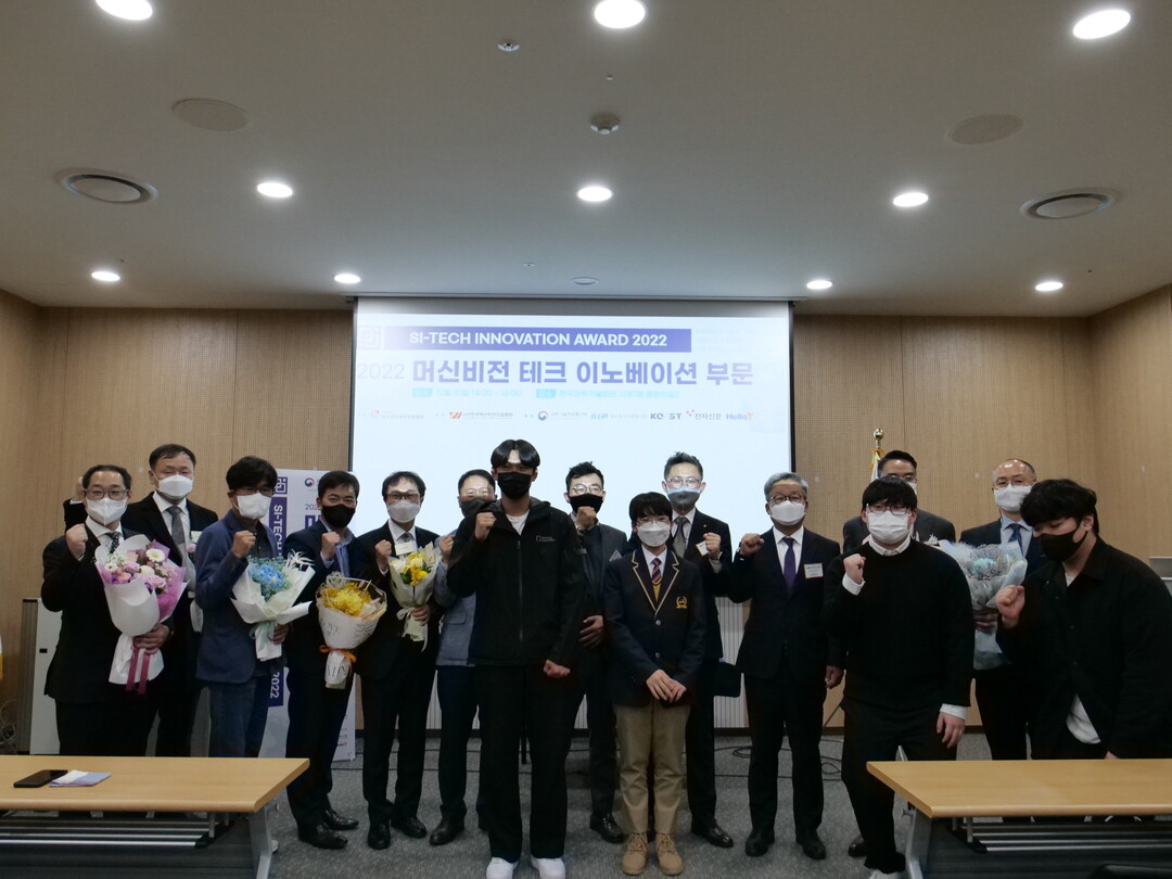 | 제16회 SI-Tech Innovation Award 2022에서 수상한 인천재능대 관계자들이 기념촬영을 하며 파이팅을 외치고 있다. 사진=인천재능대 제공 |