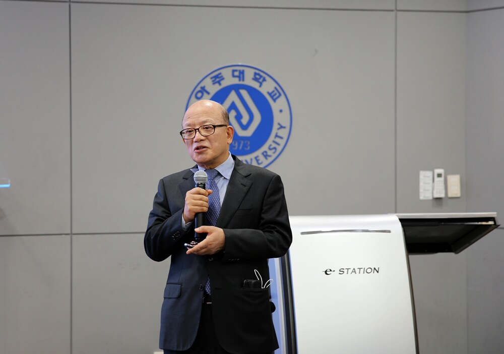 박한철 전 헌법재판소장이 아주대 로스쿨 주산법률강좌에서 강연하고 있다. 사진=아주대 제공 |