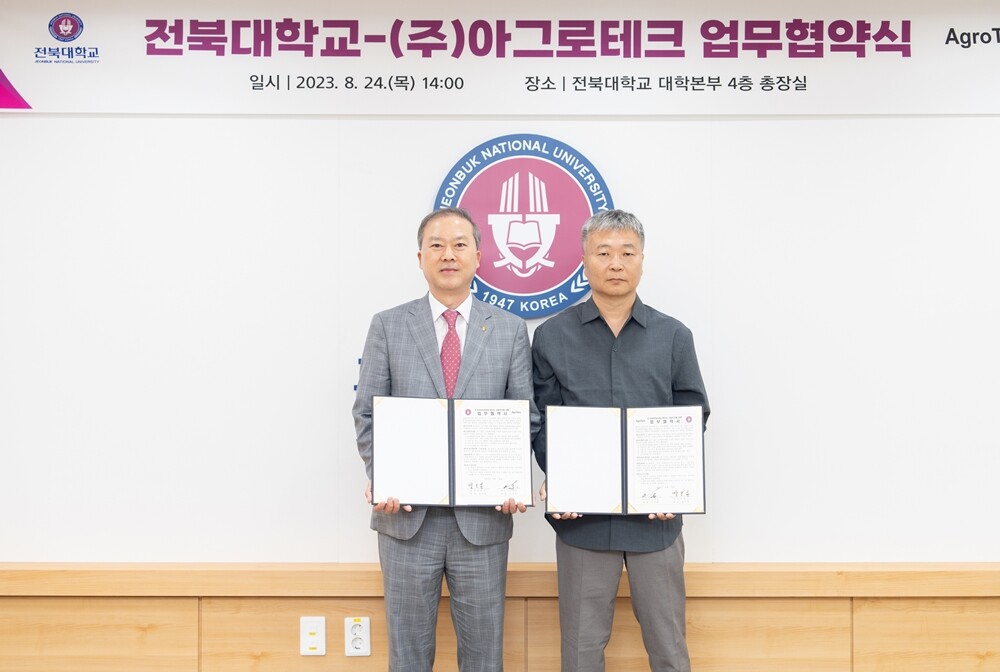 전북대가 24일 국내 스마트팜 기술을 통해 중동과 아프리카와 활발한 기술 교류를 진행하고 있는 ㈜아그로테크와 업무협약을 체결했다. 사진=전북대 제공 |