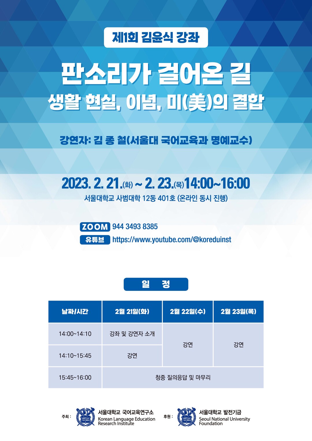 제1회 김윤식 강좌의 강연자로는 판소리 연구분야에서 뚜렷한 업적과 성과를 거둔 김종철 서울대 국어교육과 명예교수를 선정해 ‘판소리가 걸어온 길 - 생활 현실, 이념, 미(美)의 결합’이라는 주제로 연속 강연을 기획했다.