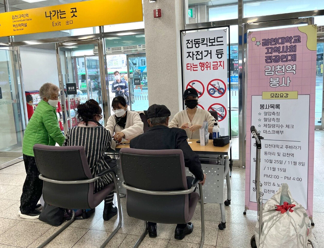 15일 김천대에 따르면 이 대학 학생들은 주민들을 대상으로 혈압과 혈당 측정 및 BMI(체질량지수)를 산출하고 성인병 예방 안내 등 건강상담을 해주고 있다.