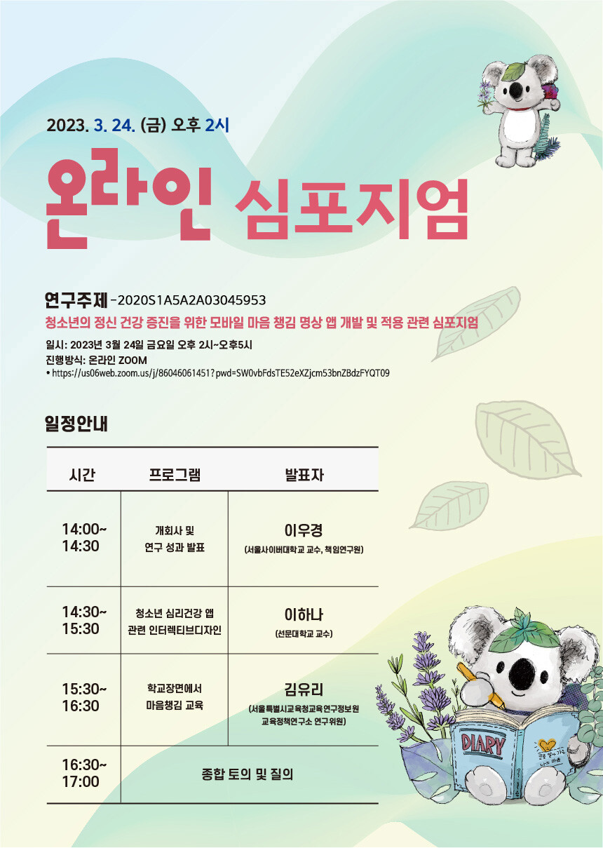 심포지엄은 이 교수의 개회사와 연구 성과 발표를 시작으로 ▲이하나 선문대 교수의 ‘청소년 심리건강 앱 관련 인터렉티브디자인’ ▲김유리 서울시교육청 교육연구정보원 교육정책연구소 연구위원의 ‘학교장 면에서 마음챙김 교육’ 주제 발표, 종합 토의 및 질의 순으로 진행된다.