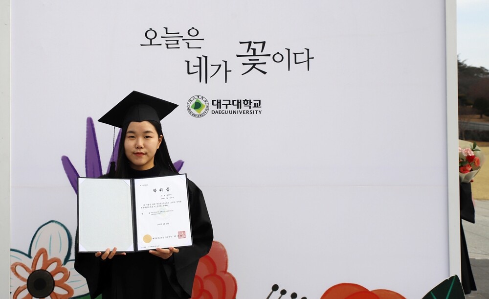 지난 17일 대구대 경산캠퍼스 교정에서 졸업 기념사진을 찍은 송현아 씨. |
