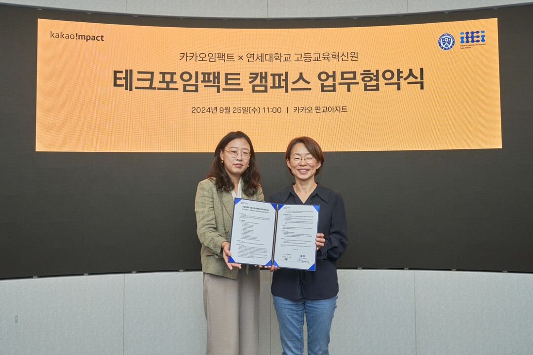 [대학저널 이선용 기자] 연세대학교 고등교육혁신원이 카카오임팩트와 9월 25일 카카오 판교아지트에서 사회문제 해결을 위한 기술 인재 육성을 목표로 ‘테크포임팩트 캠퍼스’ 업무 협약을 체결했다.