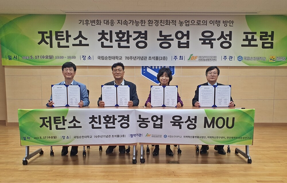 포럼에 앞서 순천대 산하 지역혁신플랫폼(RIP)사업단과 지역혁신연구센터, 연안해역위생환경연구소가 포럼 주관기관인 전남 친환경센터와 기후변화 및 탄소중립 대응과 관련 협력네트워크 구축을 위한 4자간 업무협약(MOU)을 체결했다.