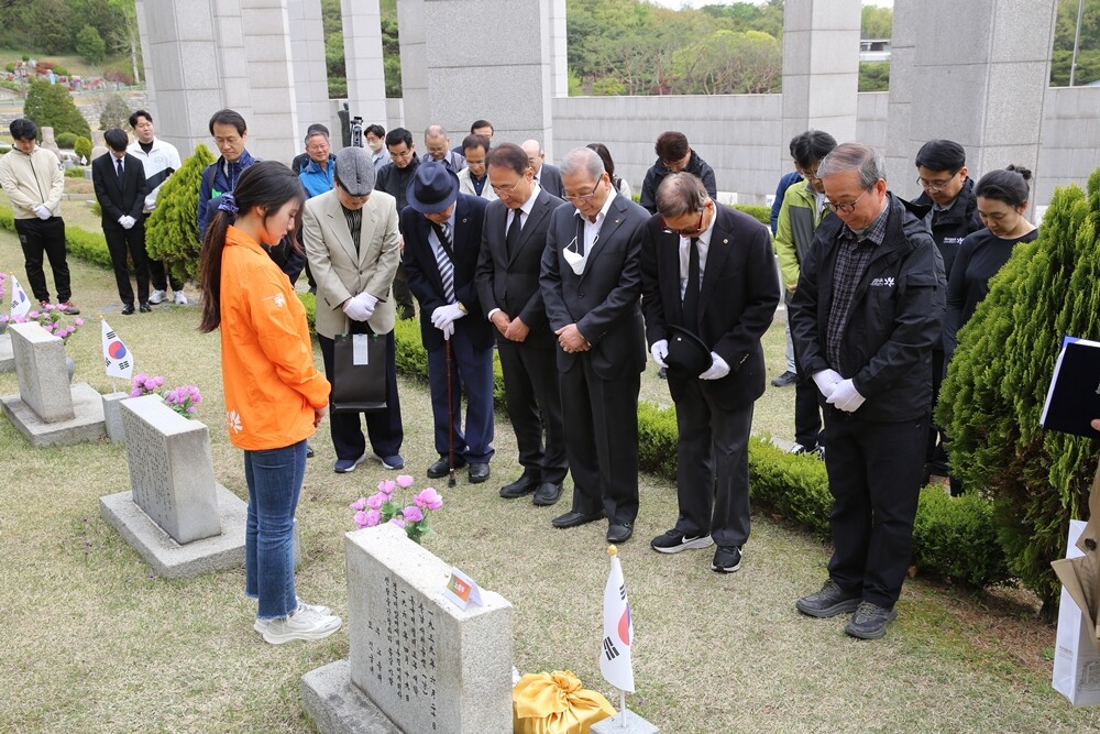윤재웅 동국대 총장과 4.19혁명에 참여했던 동국대 동문들이 14일 동국대 법학과 3학년 재학 중 4·19혁명으로 산화한 노희두 열사 기념비 앞에서 추모를 하고 있다. 사진=동국대 제공 |