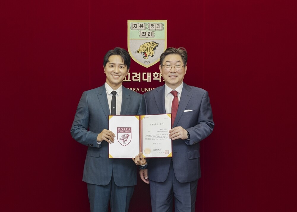조정식(왼쪽) 메가스터디 강사와 김동원 고려대 총장이 장학금 전달식에서 기증 증서를 펼쳐들고 기념촬영을 하고 있다. 사진=고려대 제공 |