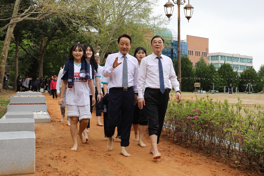 16일 개장한 조선이공대 맨발길에서 임택 광주광역시 동구청장과 조순계 조선이공대학교 총장, 학생들이 함께 맨발길을 걷고 있다. 사진=조선이공대 제공 |