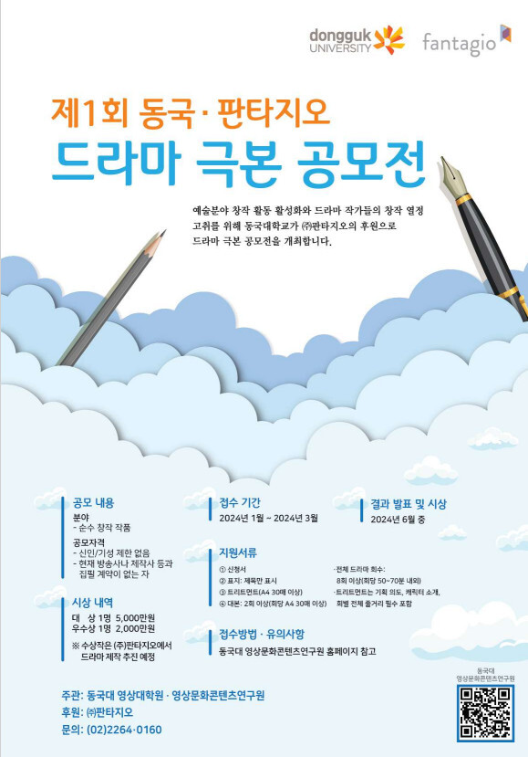동국대는 내년 1월 2일부터 3월 29일까지 제1회 동국·판타지오 드라마 극본 공모전접수를 진행한다. 총 상금은 7천만원으로 대상 1명에게는 5천만 원, 우수상 1명에게 2천만 원을 시상한다. 수상작은 ㈜판타지오가 드라마 제작을 추진한다.