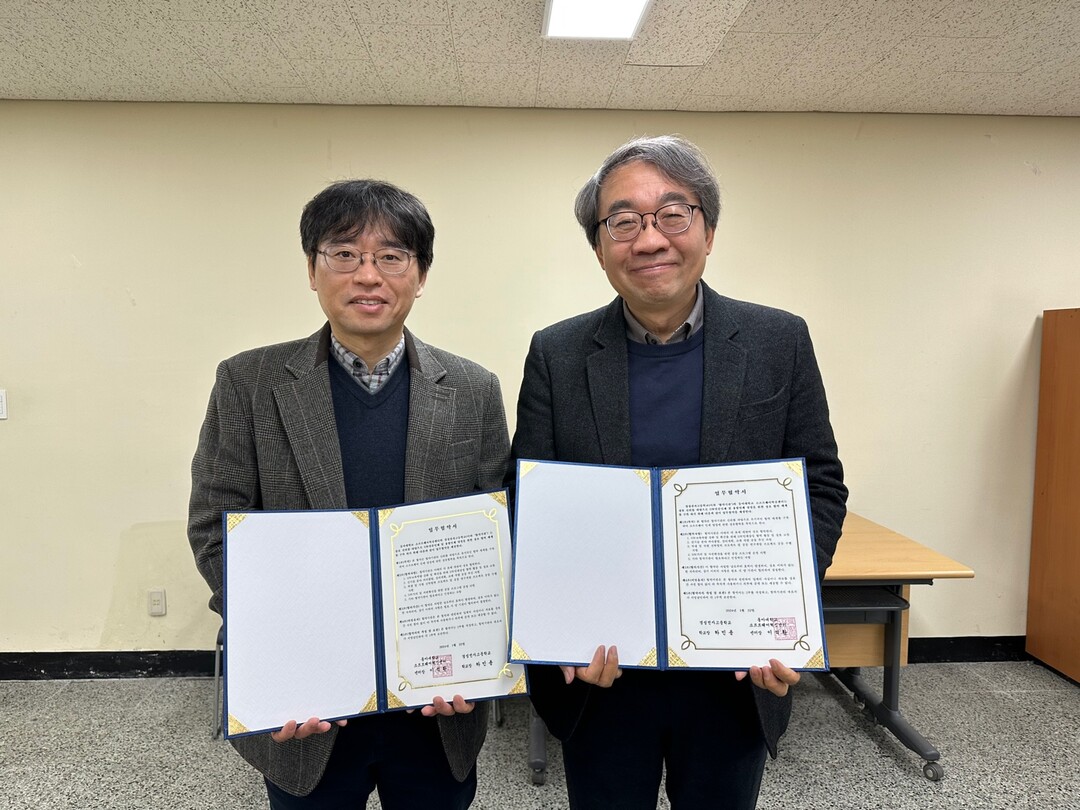 왼쪽부터 동아대 이석환 소프트웨어혁신센터장과 하민용 경성전자고등학교장이 협약 기념촬영을 하고 있다. 사진=동아대 제공 |