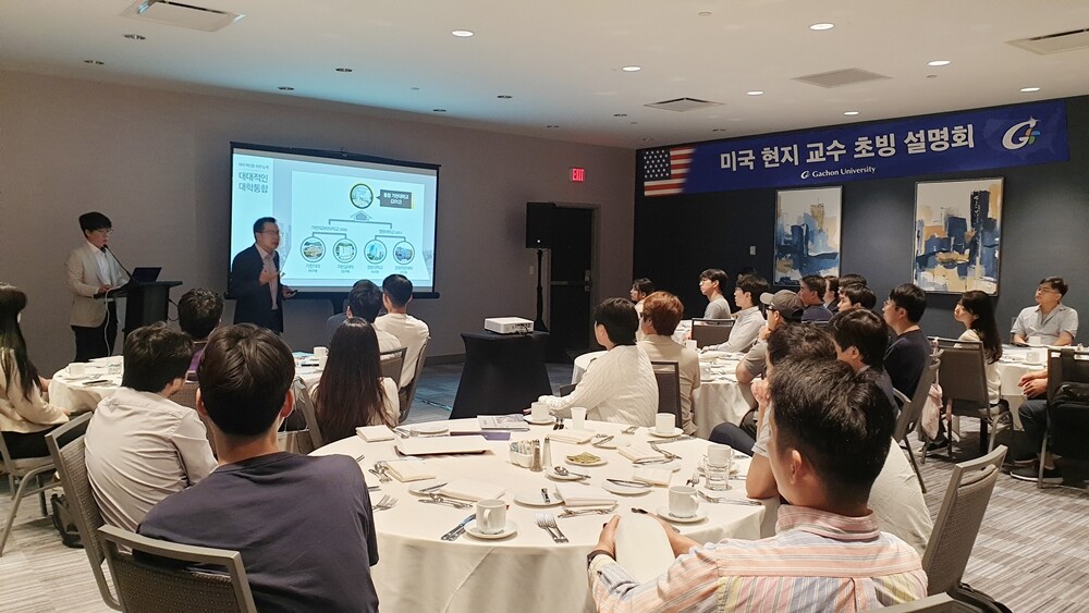 가천대가 미국 보스턴에 위치한 메리어트 호텔에서 박사 후 연구원과 빅테크연구원 등을 대상으로 교수초빙 설명회를 하고 있다. 사진=가천대 제공 |