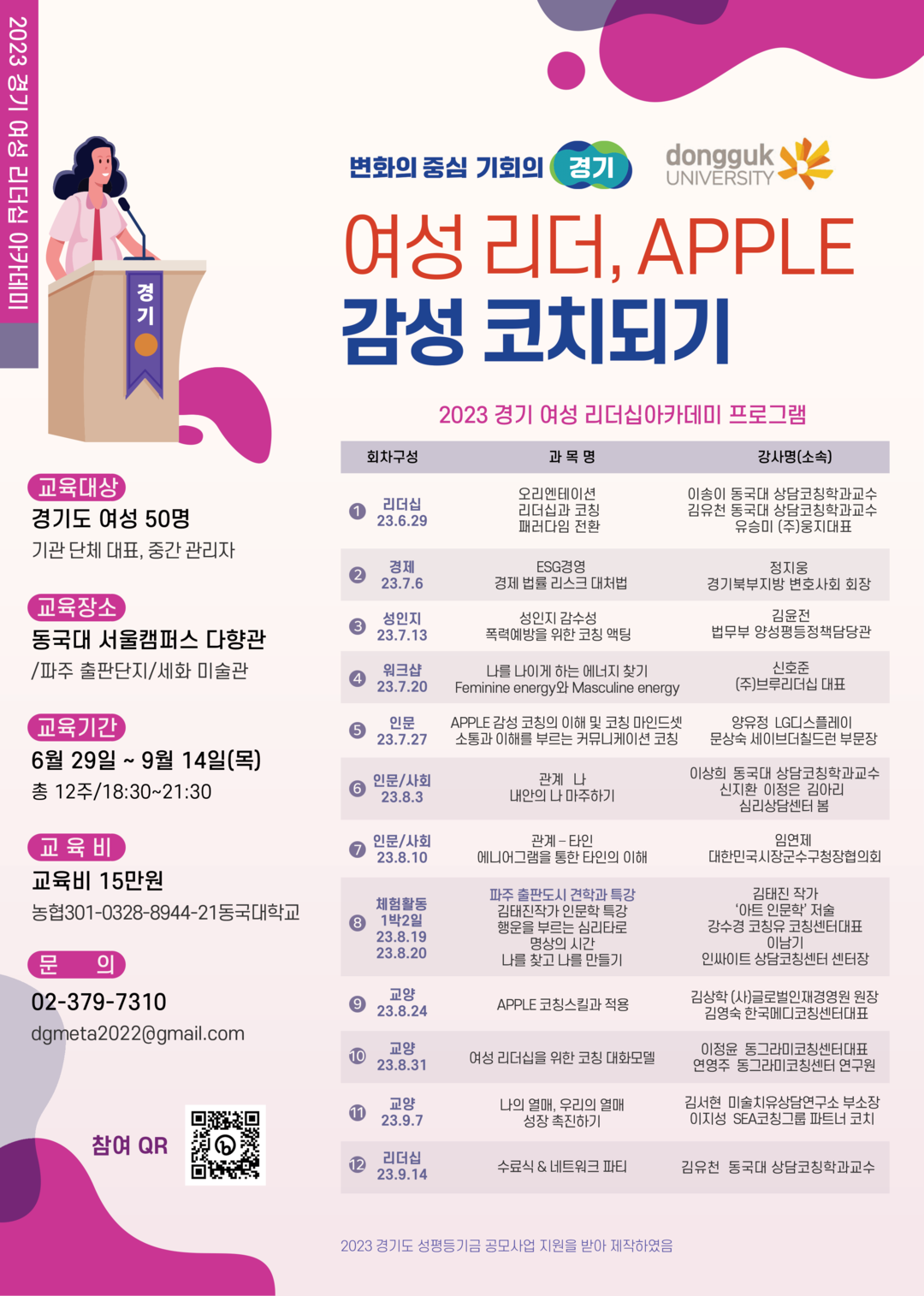 지난 2010년부터 진행돼 올해로 10회를 맞이한 경기 여성 리더십 아카데미 사업에 동국대 일반대학원 상담코칭학과와 융합상담코칭학과, 동국메타융합상담코칭센터가 사업 주관부서로 참여하게 됐다.