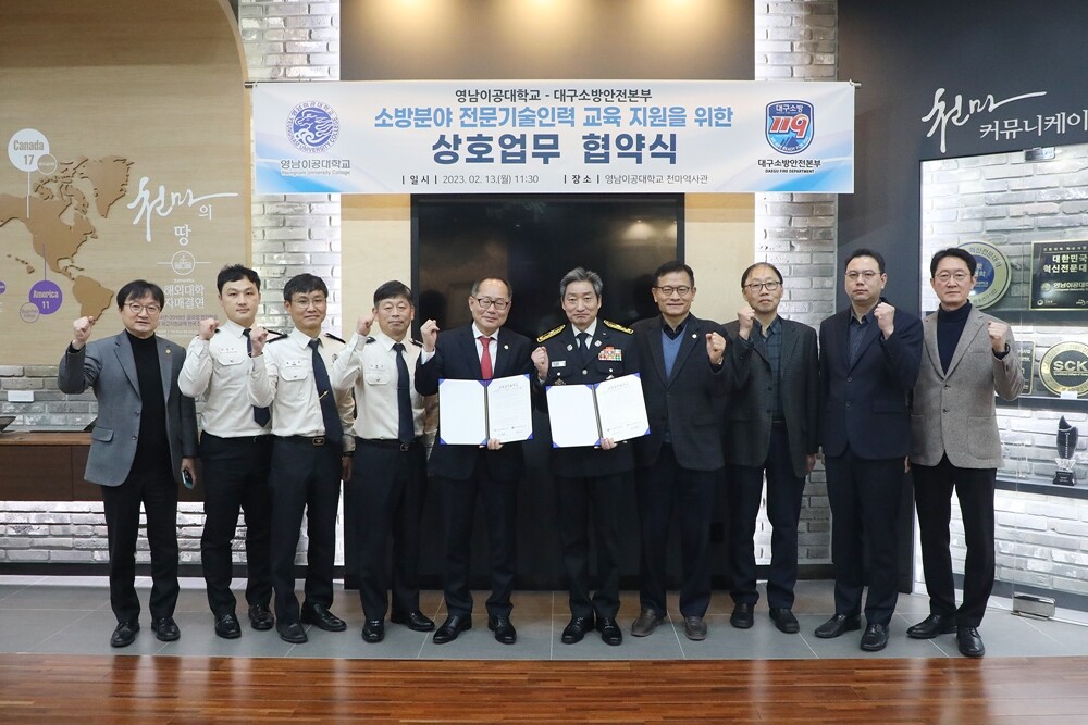 영남이공대와 대구소방안전본부 관계자들이 지난 13일 소방과 안전 분야 전문인력양성 교육 지원을 위한 협약을 맺은 후 파이팅을 외치고 있다. 사진=영남이공대 제공 |