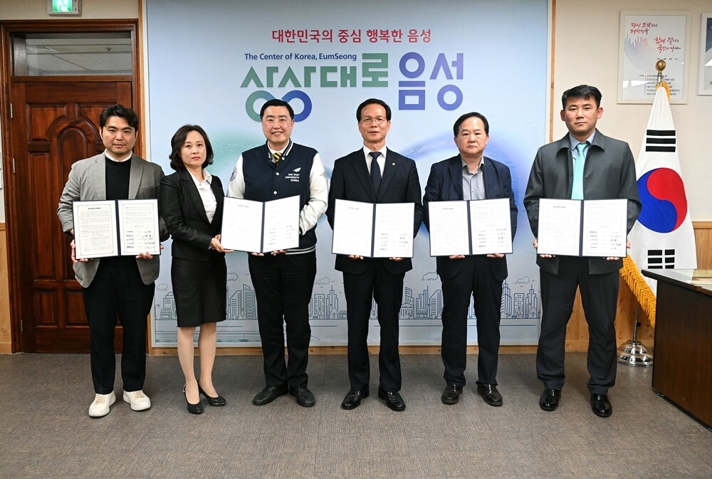 (왼쪽부터) 김주형 먹깨비 대표와 기자영 극동대 항공모빌리티학과장 , 류기일 총장, 조병옥 음성군수, 위즈윙 권승렬 대표, 노인철 마이크로드론 코리아 대표가 협약을 체결한 후 협약서를 펼쳐들고 기념촬영하고 있다. 사진=극동대 제공 |
