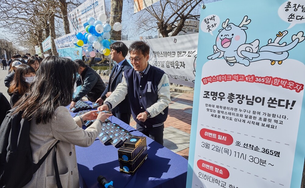 조명우 인하대 총장은 이날 오전 학생회관 학생식당 앞에서 즐거운 캠퍼스 생활을 응원하며 학생 365명에게 선착순으로 함박스테이크와 간식을 나눠줬다.