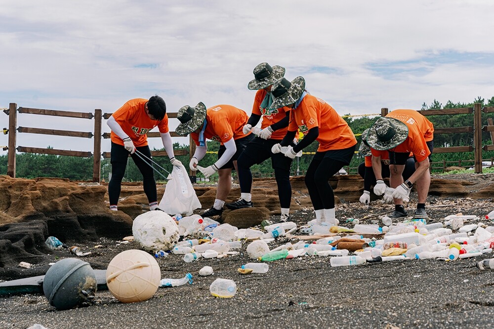 전주대 학생들이 제주도 일대에서 진행된 국토대장정 중 해양 쓰레기를 수거하고 있다. 사진=전주대 제공 |