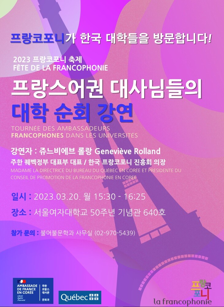이번 행사는 세계프랑코포니 주간(3월 18~25일)을 기념하는 행사의 일환으로 프랑코포니 의장국인 캐나다 퀘벡대표부 쥬느비에브 롤랑 대표와 베스마 벤레젬 상주 연구원, 이윤희 문화-교육협력 담당 상무관이 서울여대를 방문한다.