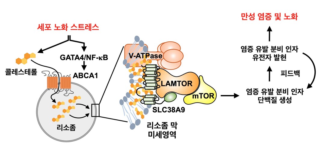 연구진은 노화 세포가 분열하지 않는 세포임에도 불구하고 높은 영양-에너지 대사 경로의 활성을 유지하고 있다는 데 주목했다. 연구진은 이같은 노화 세포의 특성이 세포 내 분해 공장으로 알려진 리소좀에 특이하게 축적되는 콜레스테롤에 의해 조절됨을 새롭게 규명하고, 해당 경로의 억제 시 노화 세포로부터 분비되는 해로운 염증 유발 인자의 생산을 크게 저해할 수 있음을 확인했다.