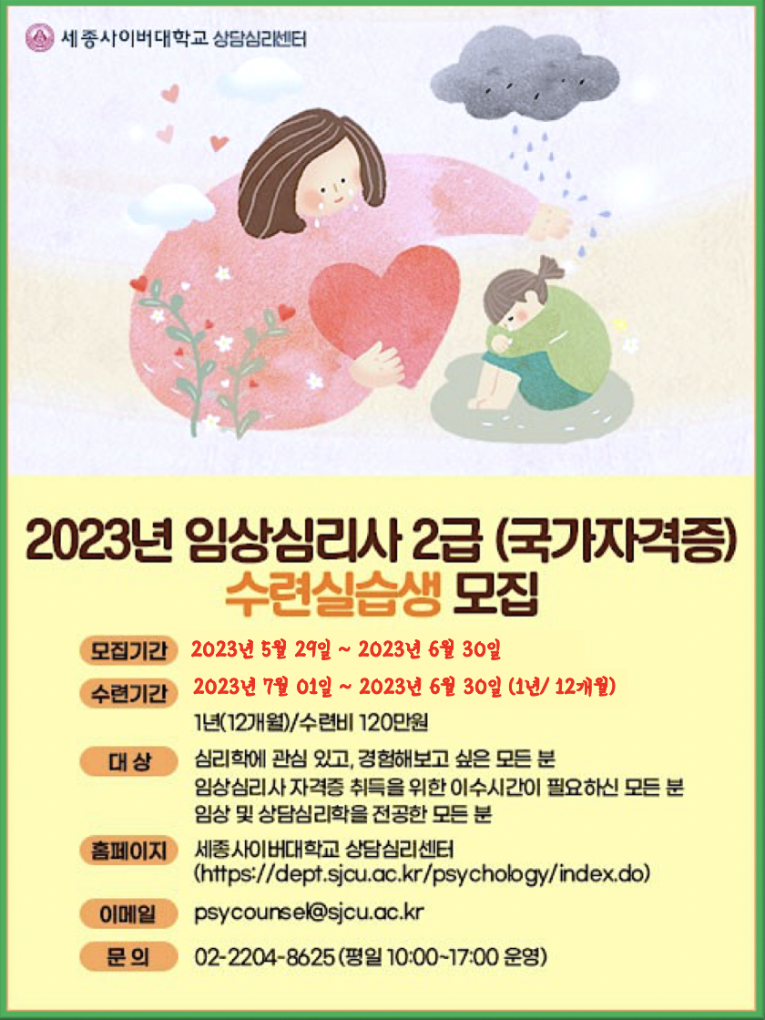 [대학저널 온종림 기자] 세종사이버대학교는 상담심리학과·예술치료학과가 임상심리자 2급 자격증 취득을 위한 수련실습생을 모집한다고 2일 밝혔다.