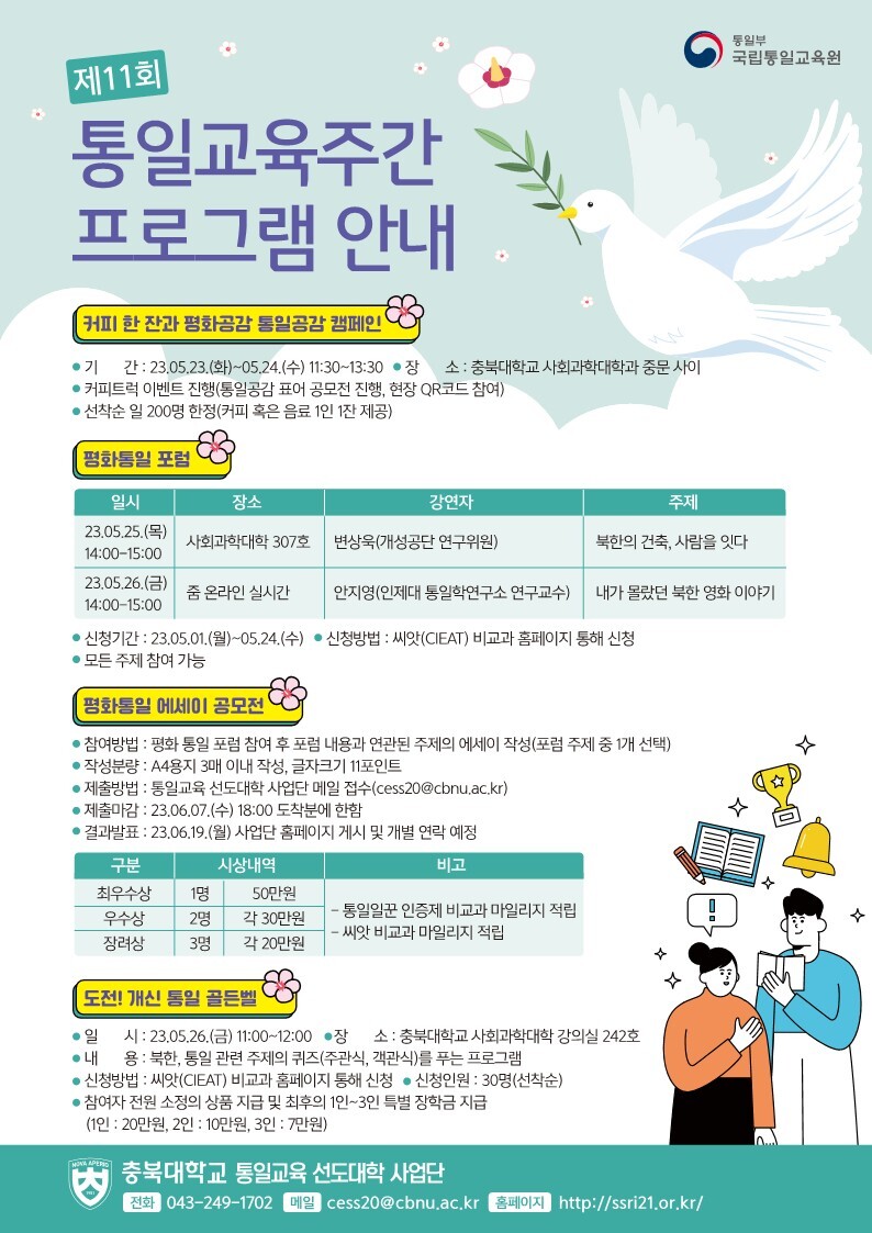 ‘평화통일 에세이 공모전’은 ‘평화통일 포럼’에 참여한 후 포럼 주제 중 1개를 선택해 에세이를 작성하여 참여하는 방식이다. 분량은 글자 크기 11포인트 기준 A4용지 3매 이내로 작성하면 되고, 통일교육선도대학사업단 메일로 접수할 수 있다. 마감은 6월 7일 오후 6시까지다.