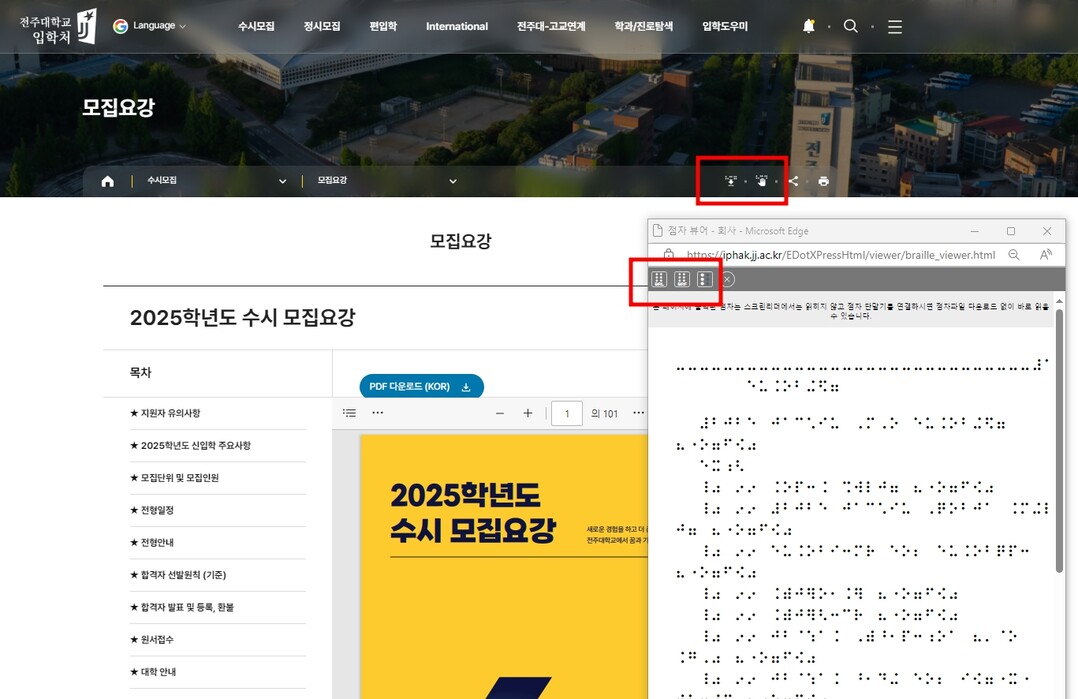 이번 서비스는 입학처 홈페이지를 새롭게 개편하며 ‘전자 점자 서비스’ 제공을 통해 시각 장애인 등 정보 취약계층 학생들의 전형 이해도 제고와 입시 정보 접근성 향상을 위해 마련됐다.