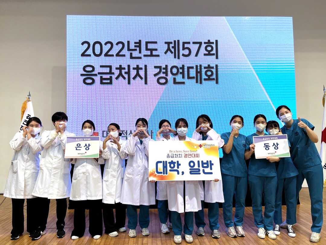 | 원광보건대 간호학과 학생들이 2022년도 제57회 응급처치 경연대회에서 은상과 동상을 수상하고 기념촬영을 하고 있다. 사진=원광보건대 제공 |