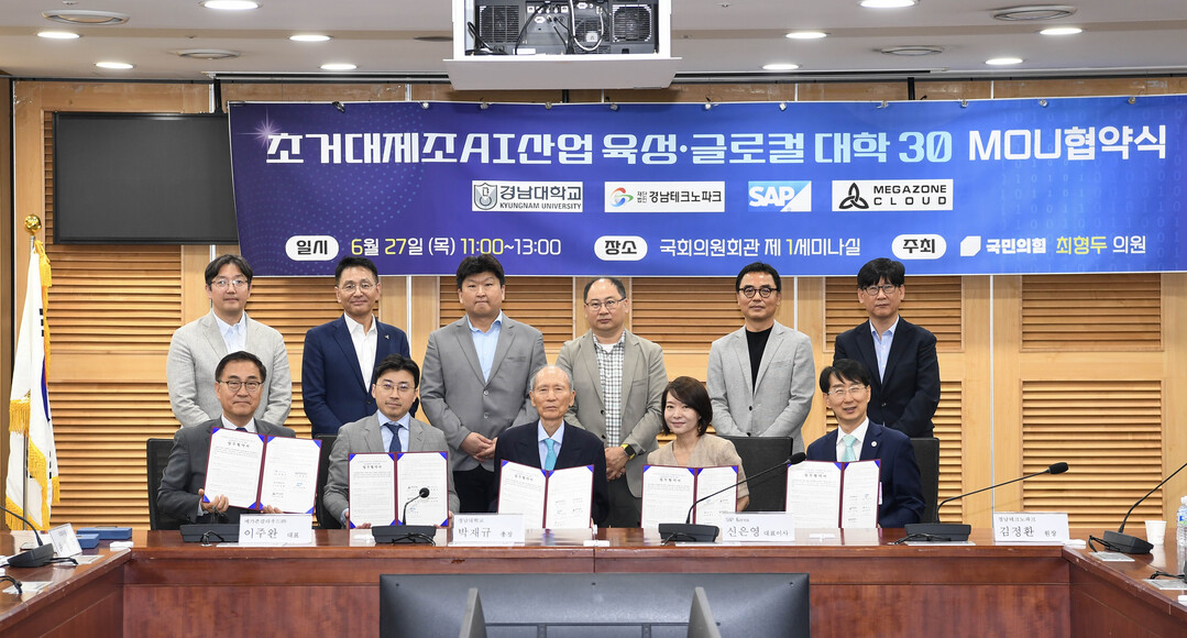 창원국가산단의 디지털 대전환을 글로컬대학 30 사업의 핵심 전략으로 삼는 경남대학교와 SAP 코리아, 메가존클라우드(주), (재)경남테크노파크, 최형두 국회의원(마산합포구)이 협약의 주체로 참여했다.