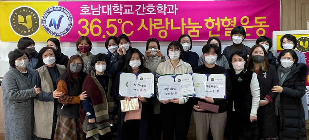 호남대 간호학과는 지난 14일 교내 건학관에서 교수진과 학생 총 45명이 참석한 가운데 ‘36.5°C 사랑나눔 헌혈 캠페인’ 현황 보고회를 갖고, 헌혈증 최다 기증자인 정원경(11매), 오서현(5매), 박우현(4매) 학생에게 각각 금·은·동상을 수여했다.