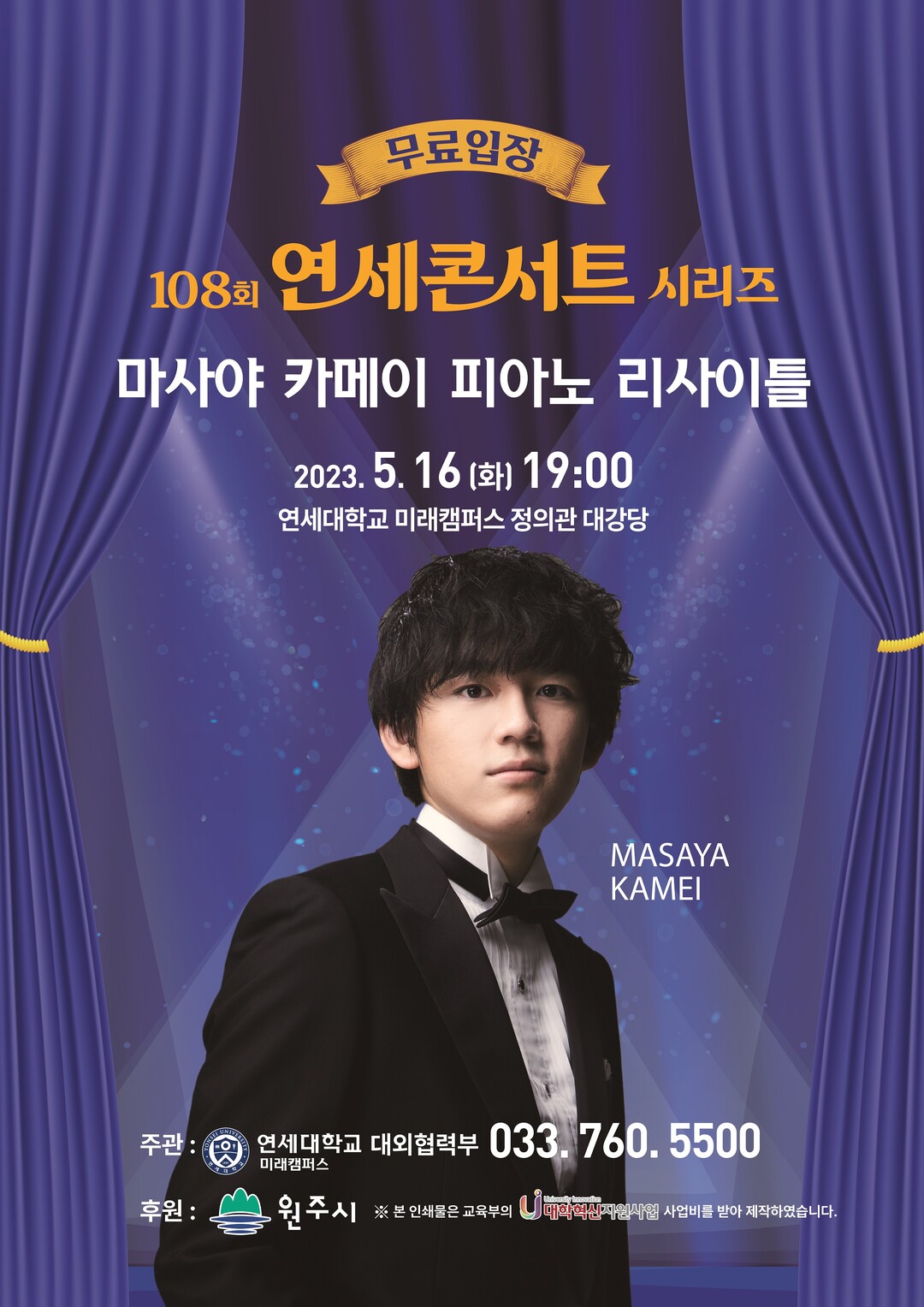 제108회 연세콘서트시리즈 주인공 마사야 카메이는 지난 2019년 일본 최대 규모의 제88회 일본음악콩쿠르 1위와 청중상, 아르헤리치 예술 진흥 재단상을, 같은 해 제43회 일본 PTNA 피아노 콩쿠르 특급 그랑프리와 청중상, 교육부 장관상, 스타인웨이 상을 연달아 수상하며 단번에 일본 최고의 차세대 피아니스트로 부상했다.