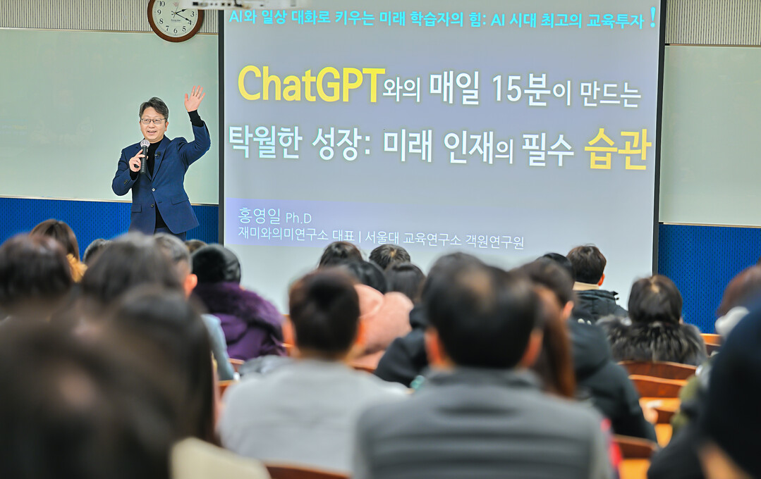 특강은 인공지능 분야의 전문가인 홍영일 교수(재미와의미연구소 대표이사, 서울대 교육연구소 객원연구원)가 강의를 진행했다. 홍 교수는 생성형 AI를 미래 교육의 핵심 도구로 강조하며, ChatGPT를 수업에 적용할 수 있는 구체적인 방법과 사례를 공유했다. ChatGPT의 기본 사용법부터 직장인들이 업무에 바로 활용할 수 있는 실질적인 적용 사례까지 폭넓은 내용을 다뤘다. 특히 급변하는 교육 환경에 발맞춘 혁신적 접근 방식을 제시하며, 참가자들에게 AI 기반 학습 도구를 활용한 교육의 가능성과 실용적 활용 방안을 깊이 있게 전달했다.