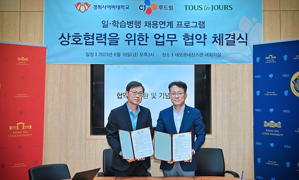 경희사이버대는 지난 16일 글로벌 외식전문 기업 CJ푸드빌과 일학습병행 채용연계 프로그램 협력을 위한 업무협약(MOU)를 맺었다고 19일 밝혔다.