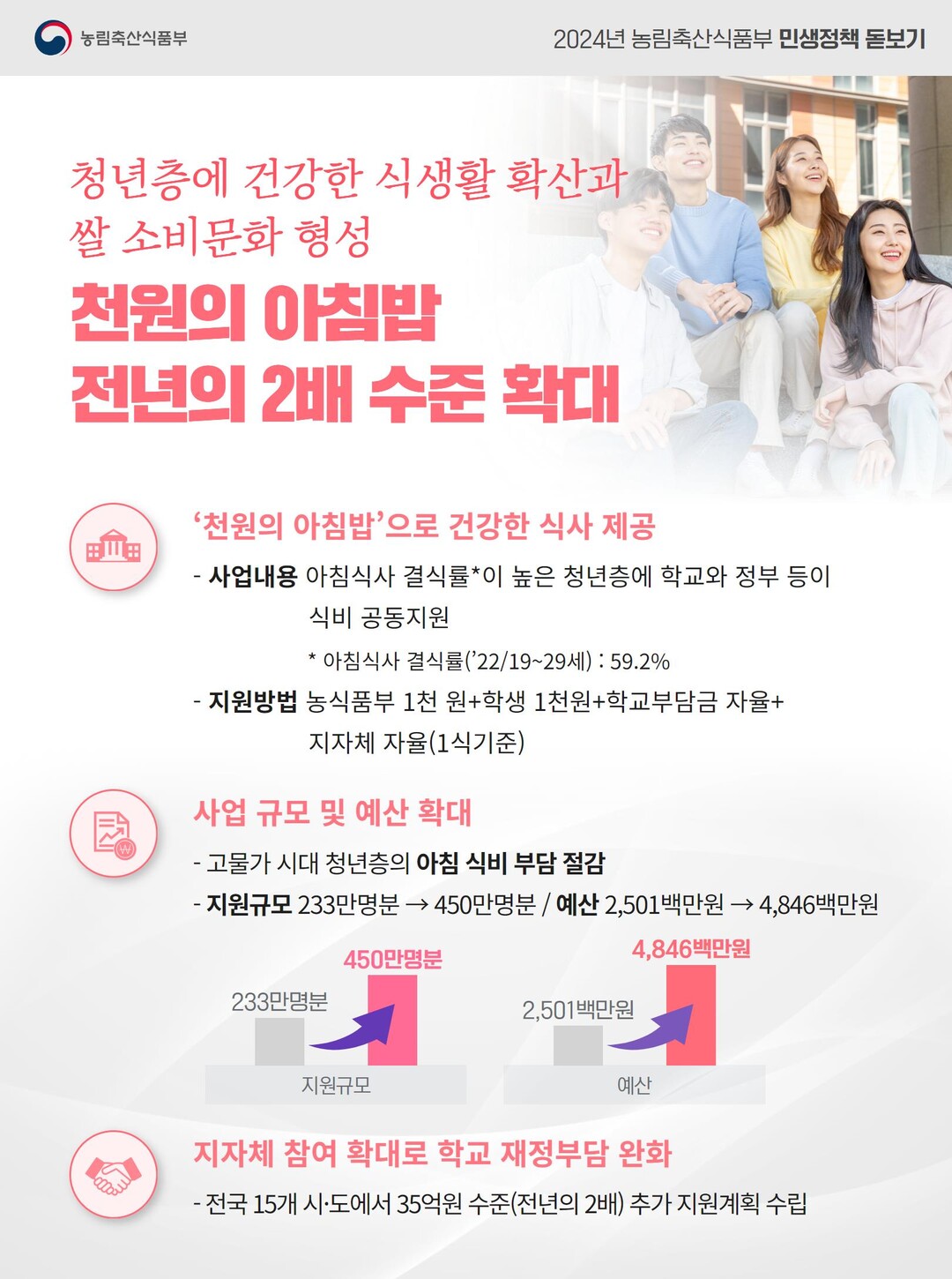 전한영 농식품부 식량정책관은 “이번 사업 확대는 고물가 시대에 학생들의 식비 부담을 덜고, 제대로 된 따뜻한 아침 식사 한 끼를 제공하기 위한 정부 노력의 일환”이라며 “아침밥을 먹는 건강한 식습관 형성을 통해 미래 세대의 쌀 소비를 늘려 쌀 수급 균형 유지에도 긍정적 효과를 가져올 것으로 기대된다”고 밝혔다.
