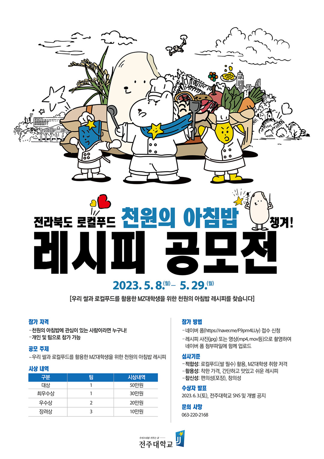전주대는 2학기 천원의 아침밥의 본격 시작을 앞두고, 우리 쌀과 전북 로컬푸드 등을 활용, MZ 대학생 맞춤형으로 간편하고 맛있고 차별화된 천원의 아침밥 제공을 위한 메뉴 개발을 위헤 이번 공모전을 계획했다.
