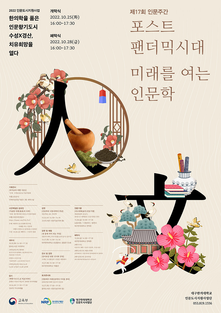 26일엔 고산도서관과 용학도서관에서 갓바위 일대 답사와 전통의학에 관한 인문학 강연이 있고 27일엔 대구한의대 박물관이 소장 중인 동의보감 판본으로 전시 강연과 약선 푸드를 활용한 체험 강연을 진행한다.