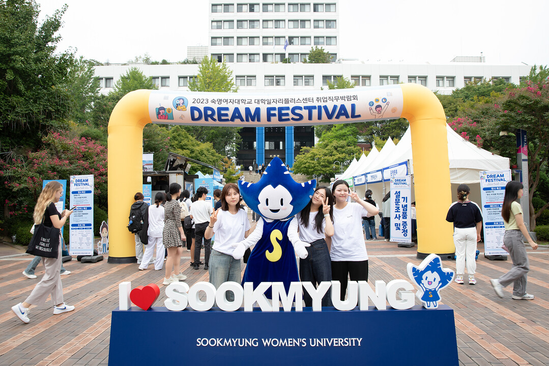 19일 숙명여대 순헌관 광장에서 열린 ‘2023 취업직무박람회’에서 학생들이 숙명여대 캐릭터 ‘눈송이’와 함께 사진 촬영을 하고 있다. 사진=숙명여대 제공 |