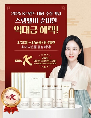 한편, 스템벨은 이번 K브랜드대상 수상을 계기로 고객과 함께 기쁨을 나누고 감사함을 전하고자 이달 3~6일, 4일간 특별 이벤트를 진행한다. 기간 내 상담을 신청하는 고객 전원을 대상으로 하며 상담을 통해 구매 시 연중 최다 구성의 추가 사은품을 제공한다. 뷰티 플래너 1:1 상담은 종근당건강 스템벨 홈페이지에서 신청 가능하다.