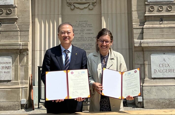 양오봉 전북대 총장이 사라 알비 파리 기후 아카데미 원장과 MOU를 체결한 뒤 협약서를 펼쳐들고 기념촬영하고 있다. 사진=전북대 제공 |